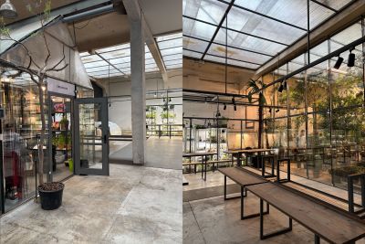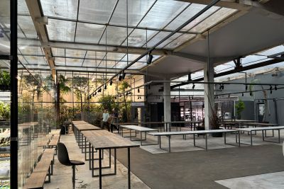 «Оранжерея для бизнеса»: Лаборатория «Корни» Индустриальный интерьер, высокий потолок, длинные столы и море зелени.