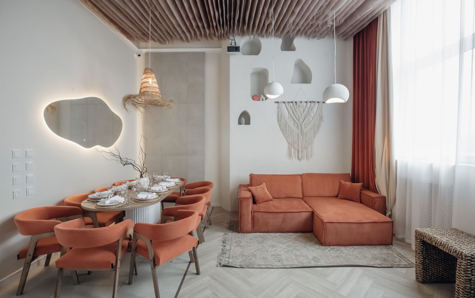В этом зале органика и стиль сливаются в идеальной гармонии. Натуральные текстуры, зелёные акценты и плавные линии создают тёплую атмосферу для камерных встреч и стильных вечеров. Пространство вдохновляет на неспешное наслаждение каждой деталью.