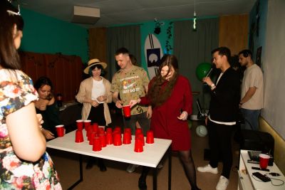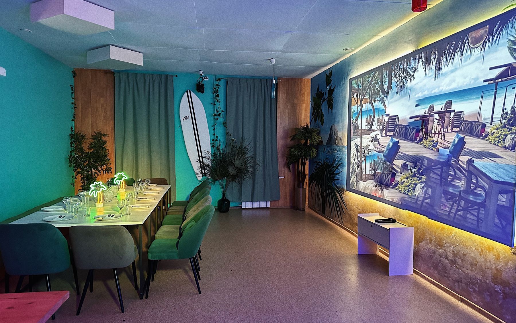 Неоновые вывески, картины, 3 длинных стола, барная стойка, диско шар, фотозона из пайеток, светомузыка и многое другое будут радовать Вас весь вечер!