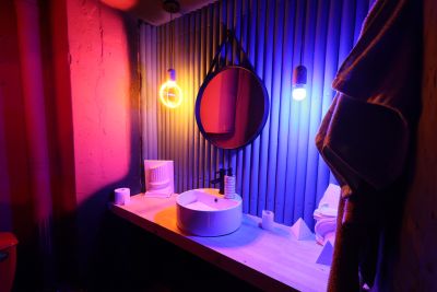 Зал Лофт - классический стиль с неоновой подсветкой и арт-объектами