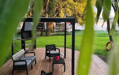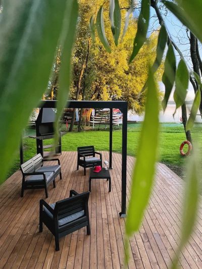 Терраса с беседкой и мангалом у воды в серф-станции Pro-veter в Строгино