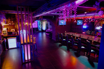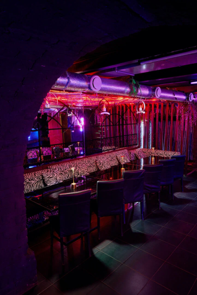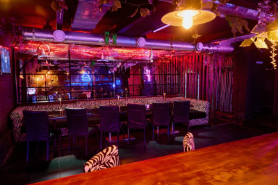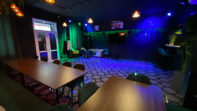 Зал BANG с панорамными окнами, камином и барной стойкой на Преображенке