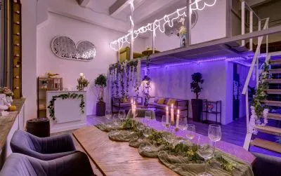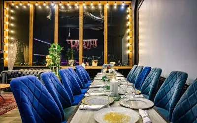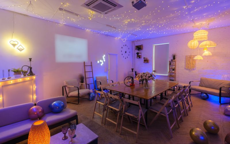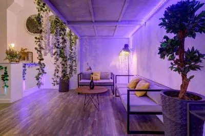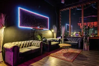 Зал Лофт - классический стиль с неоновой подсветкой и арт-объектами