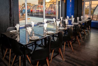 Зал BANG с панорамными окнами, камином и барной стойкой на Преображенке