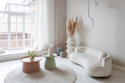 Светлый и яркий зал в курортном стиле