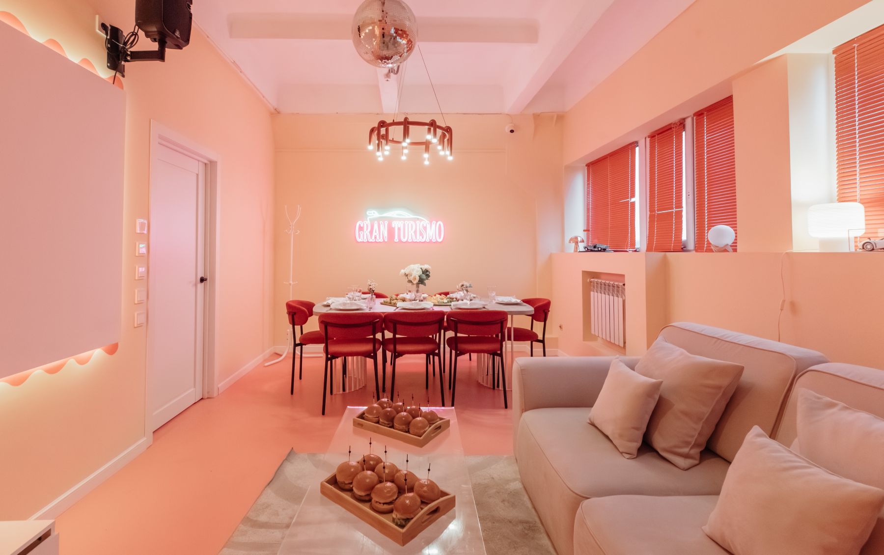 Пространство, где неоновый глянец и мягкие пастельные оттенки создают идеальные декорации для стильных вечеринок. Округлые формы, винтажные постеры и атмосферный свет придают ему богемное, но уютное настроение.