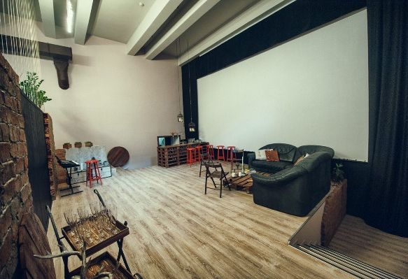 Центр города, стиль лофт, продуманный до мелочей интерьер, семиметровые потолки. Просторное и в тоже время уютное пространство с огромным экраном для проектора (диагональ экрана 9метров), светлыми стенами и естественным светом.