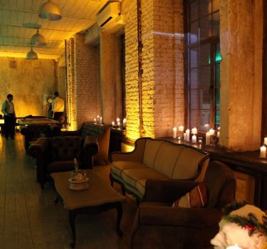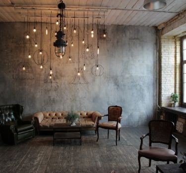 • Антикварный кожаный диван, винтажный телескоп на полутораметровых металлических ножках и большой раритетный фонарь на подъемном механизме