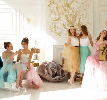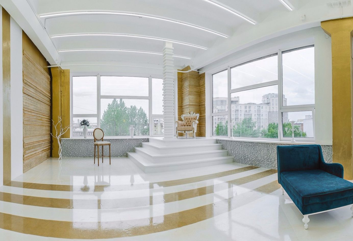 Великолепный светлый зал, одновременно сочетающий в себе минимализм в отделке с роскошью золотых деталей интерьера, идеально подходит для проведения девичников, свадебных церемоний и праздников. Первое, что бросается в глаза – блестящий глянцевый белый цвет пола. Он отражает все поверхности, что создает дополнительный зрительный объем.