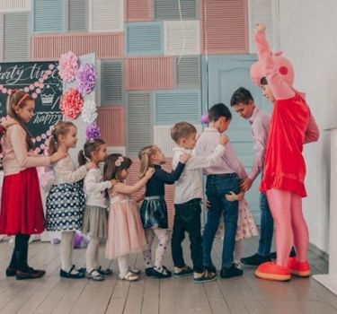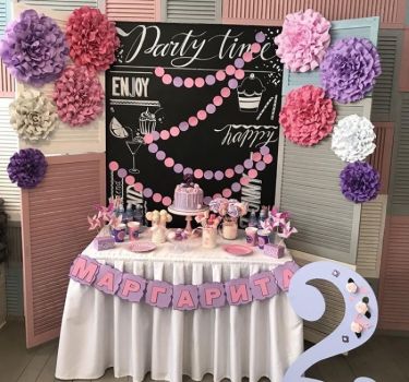 Удобная барная стойка станет центром притяжения для детей и взрослых, многоуровневый подиум с подушками разместит всех гостей, яркая стена из дверей скрывает за собой меловую доску и послужит отличным фоном для ваших фото, камин со старыми книгами создаст домашний уют, декоративные элементы оставят особое впечатление праздника.