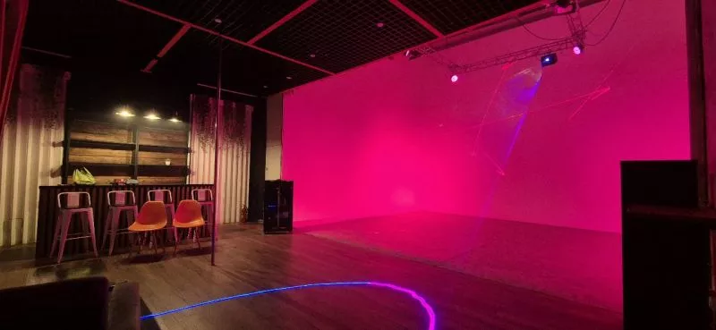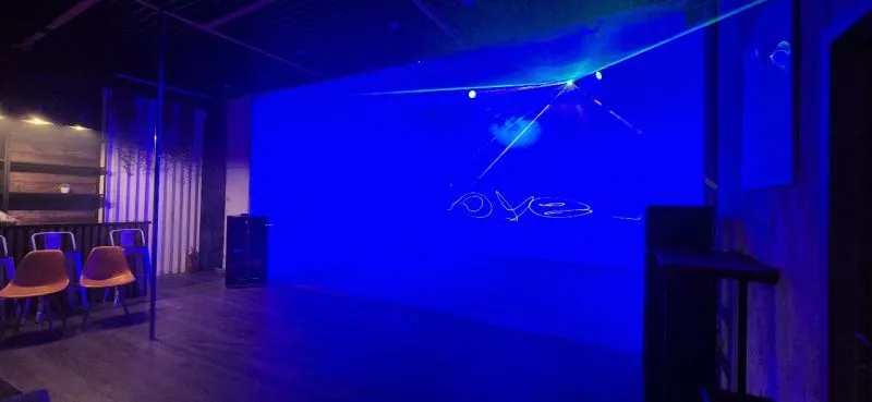 Помещение двухуровневое, каждый уровень по 50м2, высота каждого по 3,5 метра. Напротив танцпол 50м2, выстой 8 метров, с подвесным световым оборудованием, лазерным шоу, 4К проектором для караоке или фильмов.