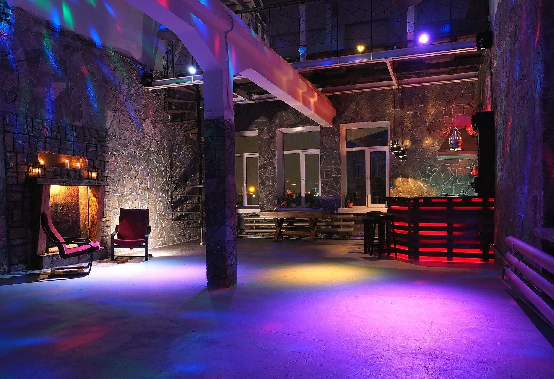 2-х уровневый Лофт с барной стойкой. Встроенный диско свет и шикарный звук для ночной дискотеки, функциональная барная стойка и второй этаж с лаунж зоной – все что нужно для развлечений и отдыха в одном пространстве.