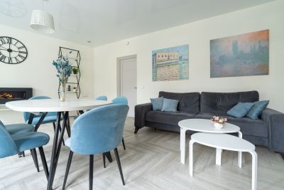 Большие панорамные окна и картины французского художника Анри Руссо создают атмосферу тепла и отдыха вдали от шумного города. Декор и акценты ручной работы из натуральных материалов.
