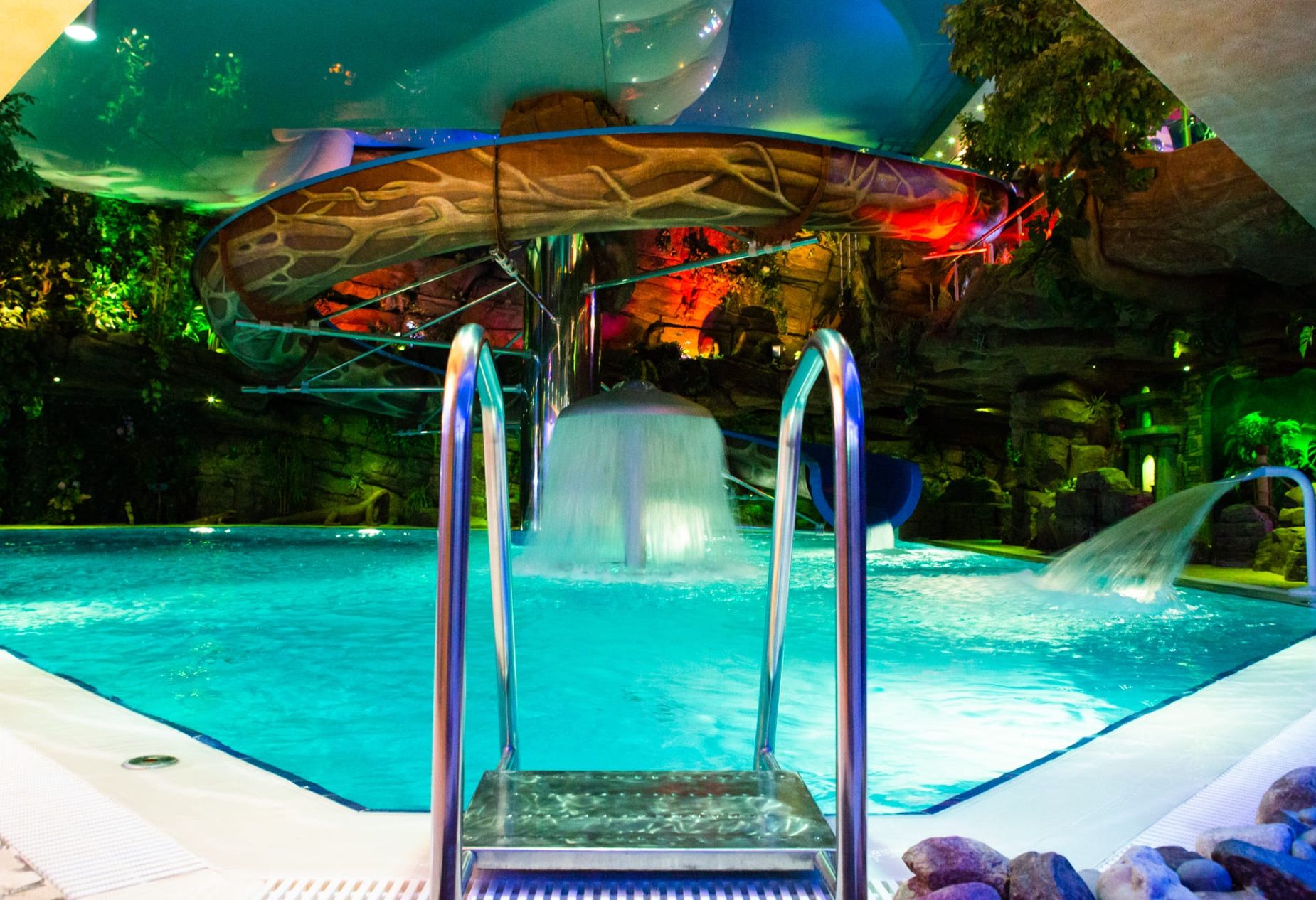 — Бассейн с горкой, водопадами, системой подачи волн и отдельным джакузи