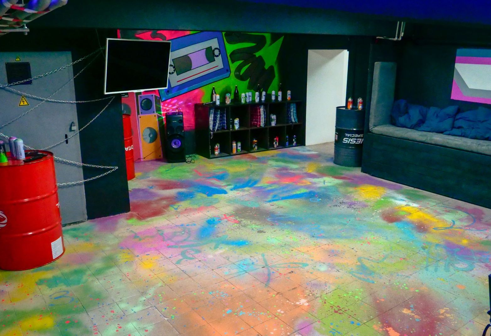 Светящийся разными цветами лофт с яркими граффити