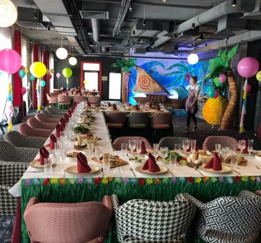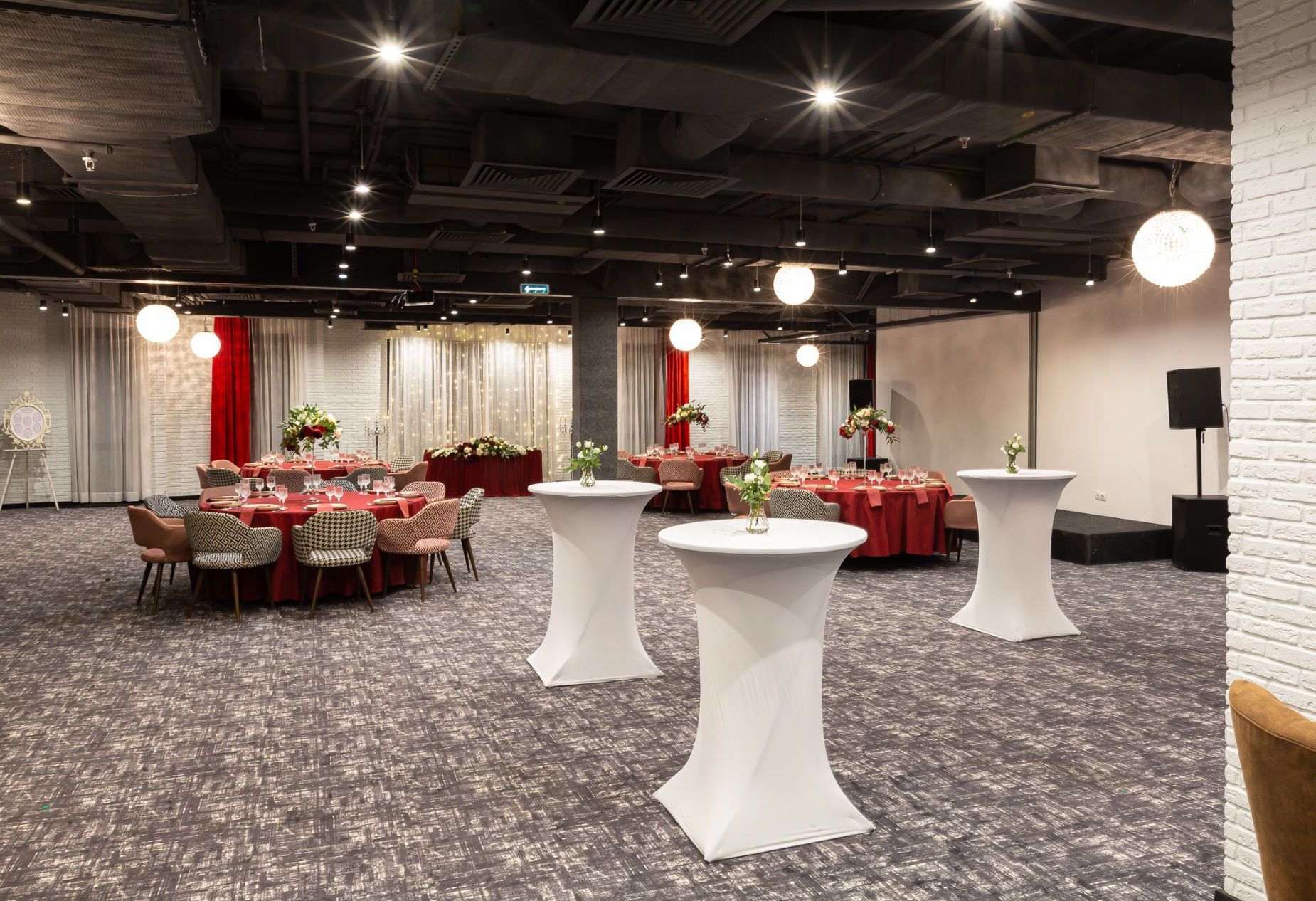 Банкетный зал располагается на 3 этаже, 300 м2, банкетная и театральная рассадка 120 человек, фуршет – 240 (разделяется на два отдельных зала)