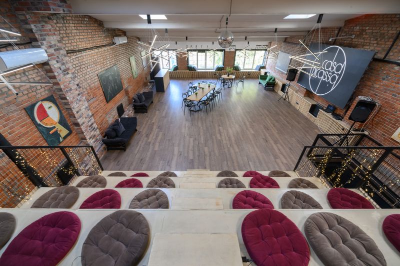 Мансардный зал с амфитеатром на 120 участников: полный техпак, гибкое зонирование и прозрачные расходы для тренингов, презентаций и банкетов.