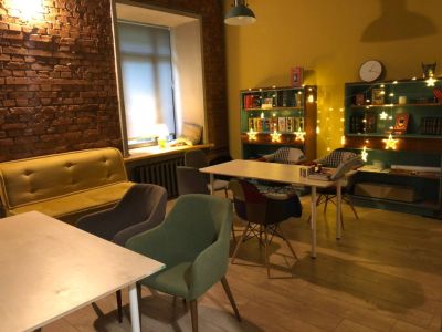 Уютное, ламповое пространство со свежим ремонтом, камерной творческой атмосферой, с большими окнами и глубокими подоконниками.