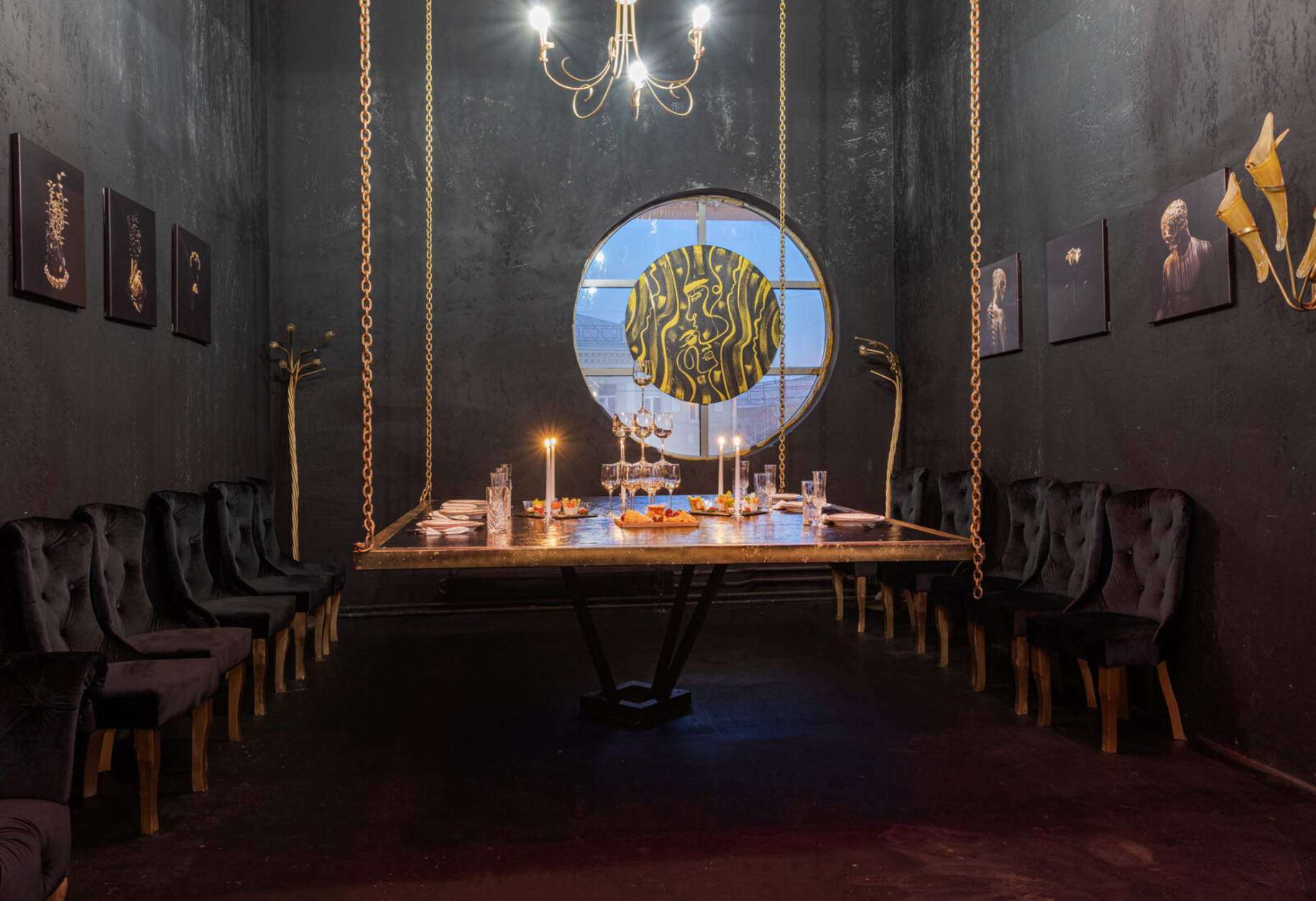 Абсолютно черный интерьер в стиле барокко с золотыми античными статуями, картинами и поражающий масштабностью подвесной стол на цепях. Окна комнаты открывают панорамный вид на историческую Москву