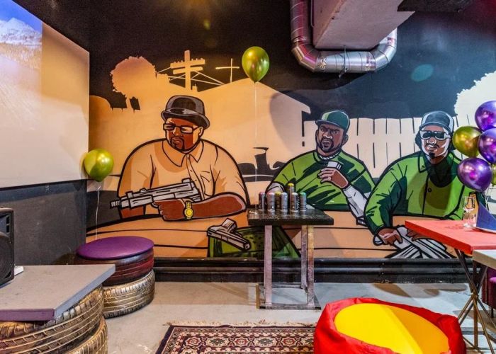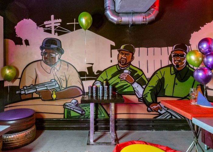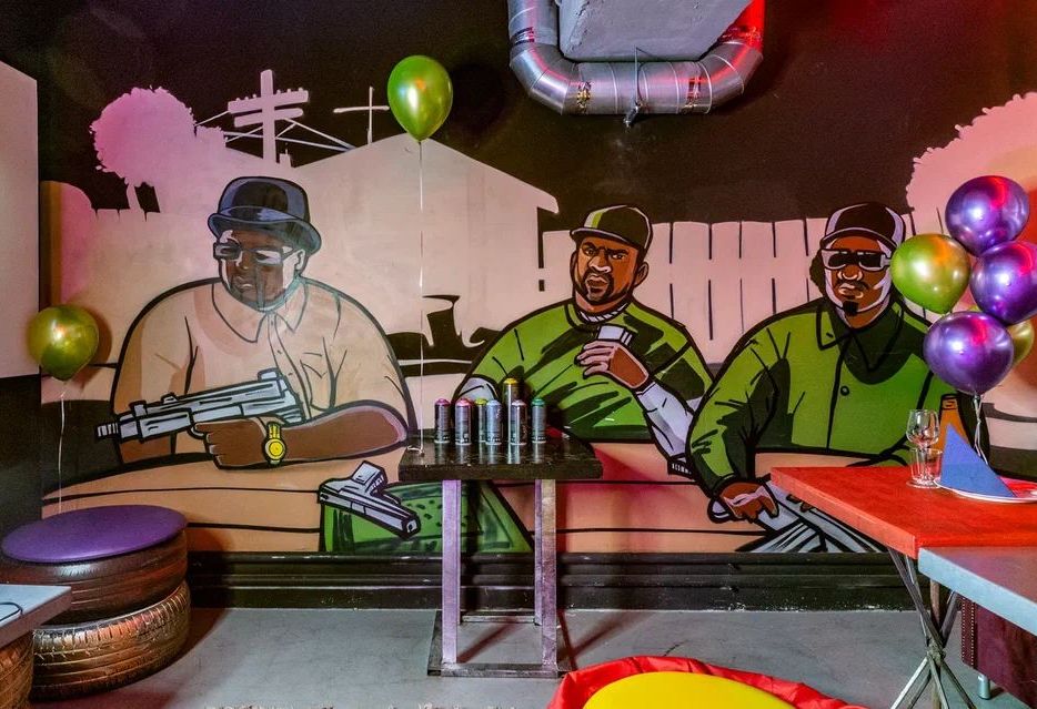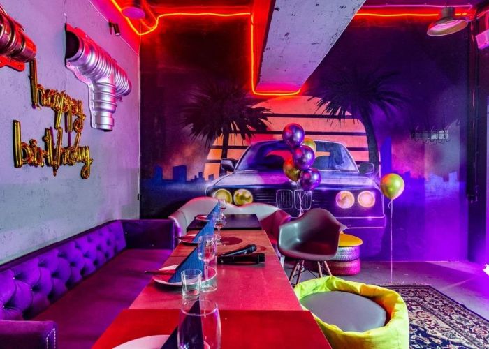 Комната для фанатов скорости и GTA Vice City. Кибер-атмосферу создают неоновые инсталляции и арт-объекты виде оружия.