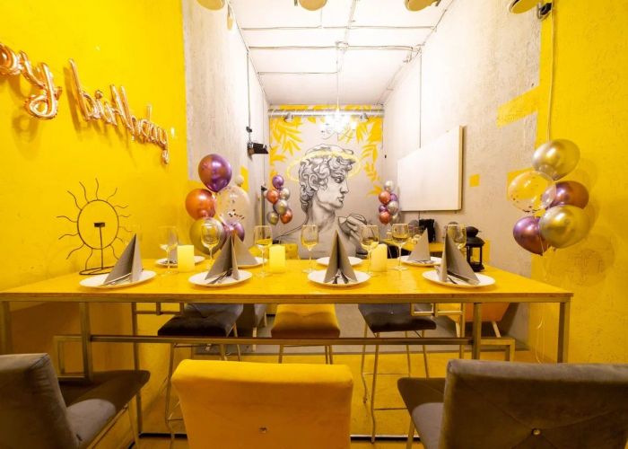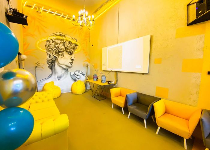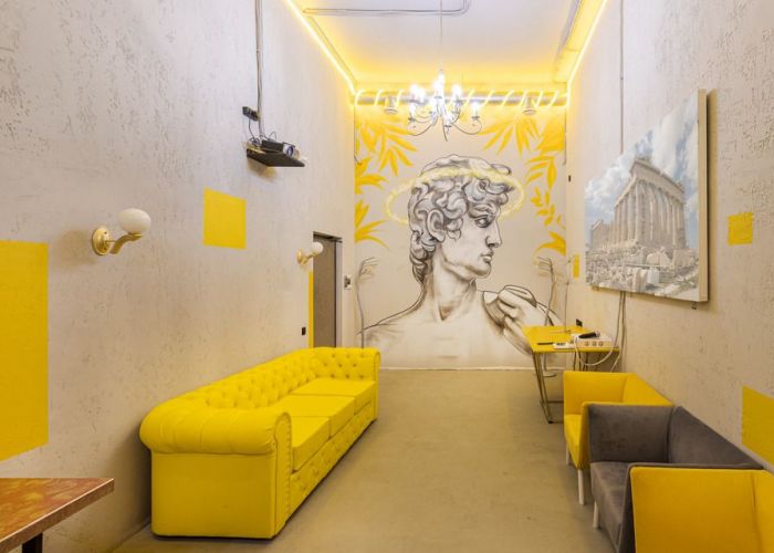 Перенеситесь в вымышленный мир античности! В этой комнате атмосфера роскошной эпохи барокко, вдохновленной античным миром, соединяется с самыми современными технологиями. Солнечно-желтое пространство, большое количество живых растений, а на одной из стен изображен главный символ красоты — Давид.