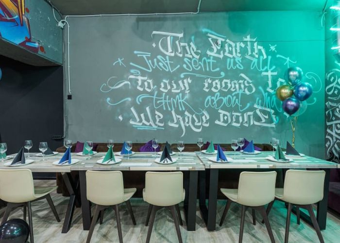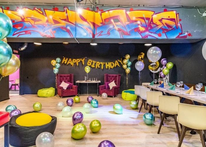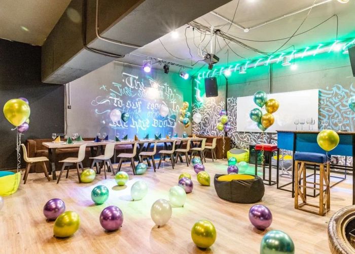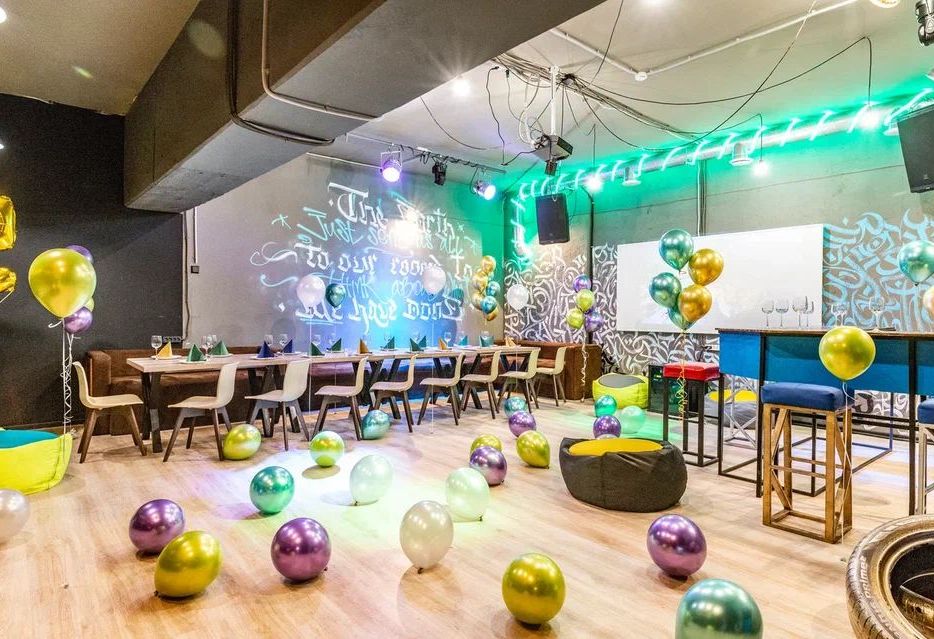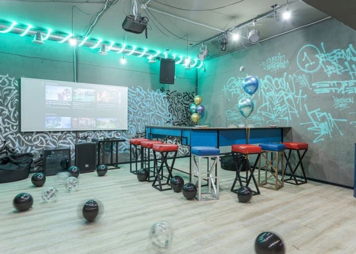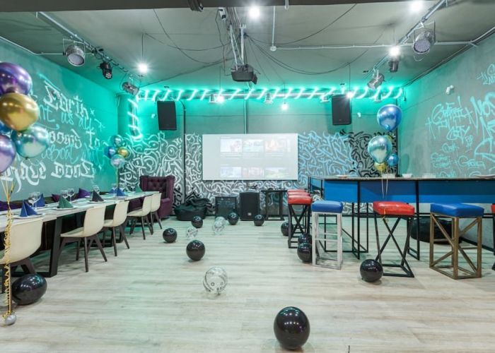 Комната с яркими граффити на стенах и большим количеством посадочных мест, сценой и проектором отлично подойдет для проведения конференций, нетворкингов. Возможна конфигурация с гримеркой.