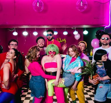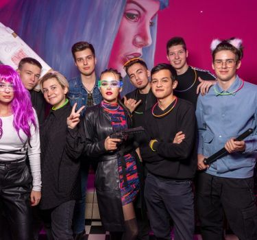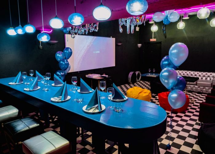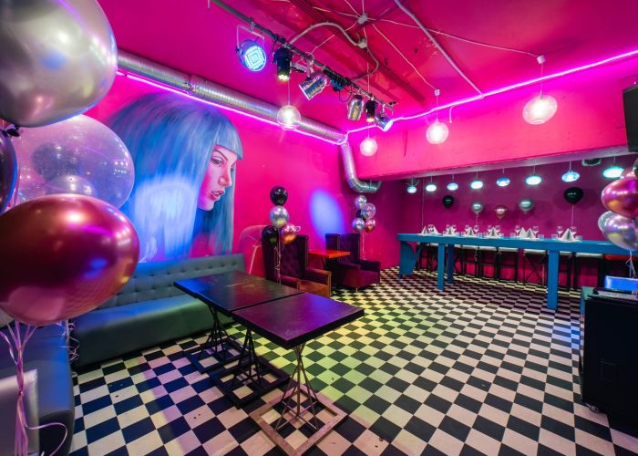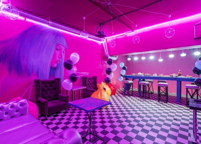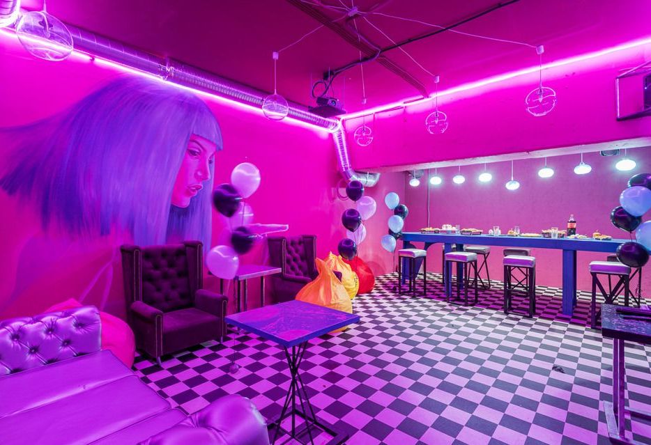 Футуристичное пространство в неоновых оттенках и шахматным полом. Основной акцент на большой барной и лаунж зонах в стиле киберпанк, а эффектности добавляют арт из фильма «Бегущий по лезвию» и манекены хромированных оттенков.