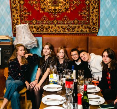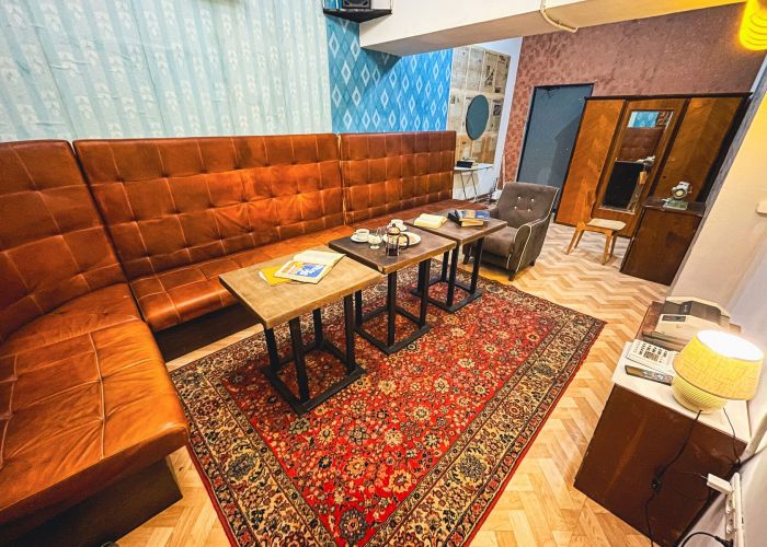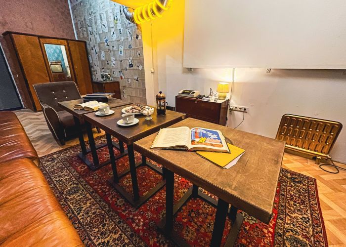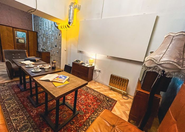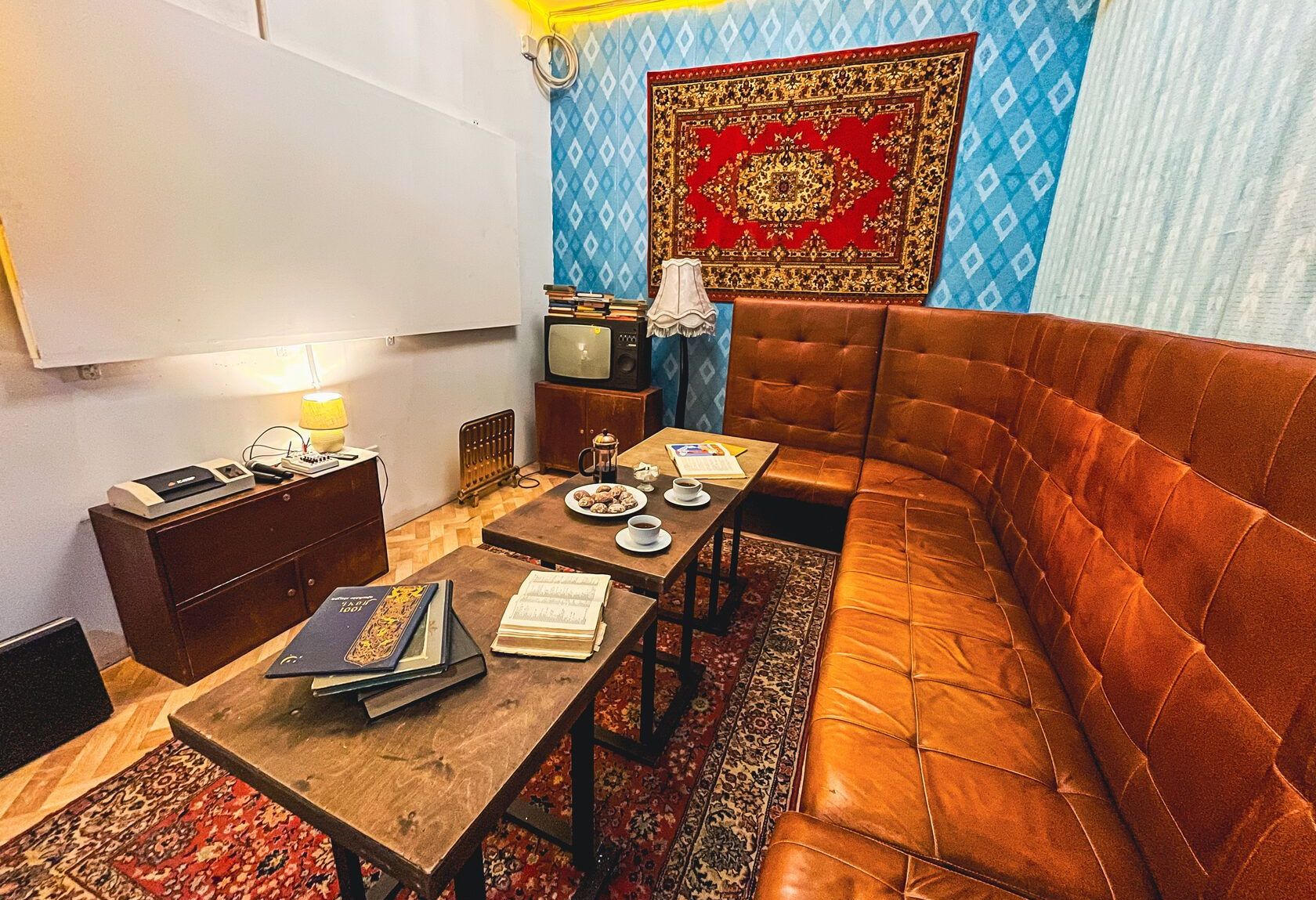 Почему бы не организовать уютный квартирник для компании близких друзей в атмосфере 60-х? Здесь ваши гости точно скажут: «Я требую продолжения банкета!» Комната в любимом стиле наших бабушек и дедушек, ковры на стенах, плакаты, фото и раритетная мебель советской эпохи, а по экрану большого телевизора идут советские добрые фильмы.