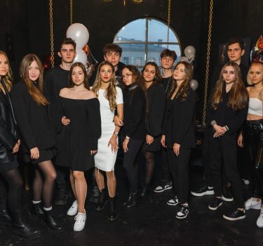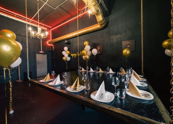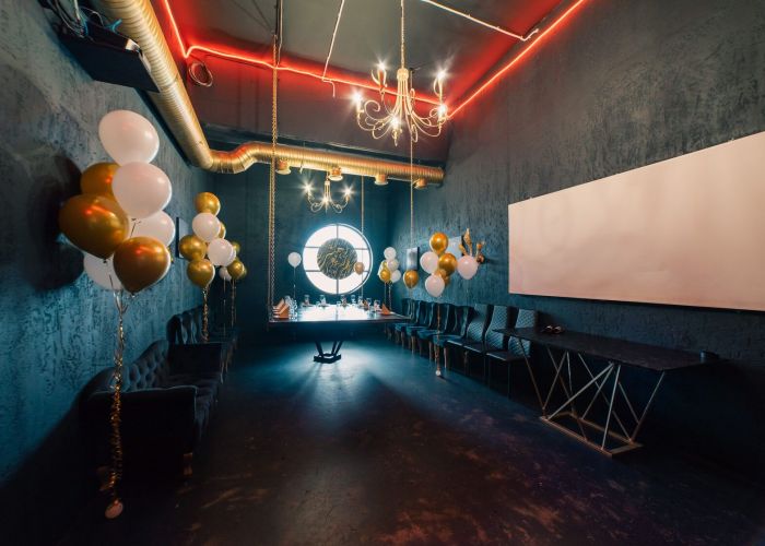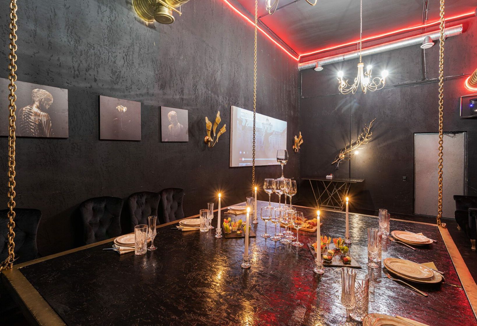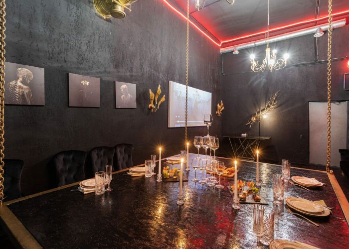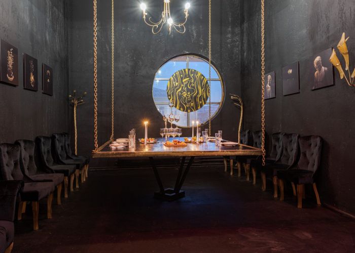 Абсолютно черный интерьер в стиле барокко с золотыми античными статуями, картинами и поражающий масштабностью подвесной стол на цепях. Окна комнаты открывают панорамный вид на историческую Москву.