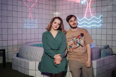 Неоновая фотозона с прозрачным креслом-шаром,