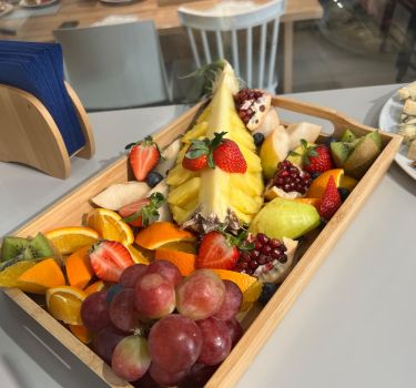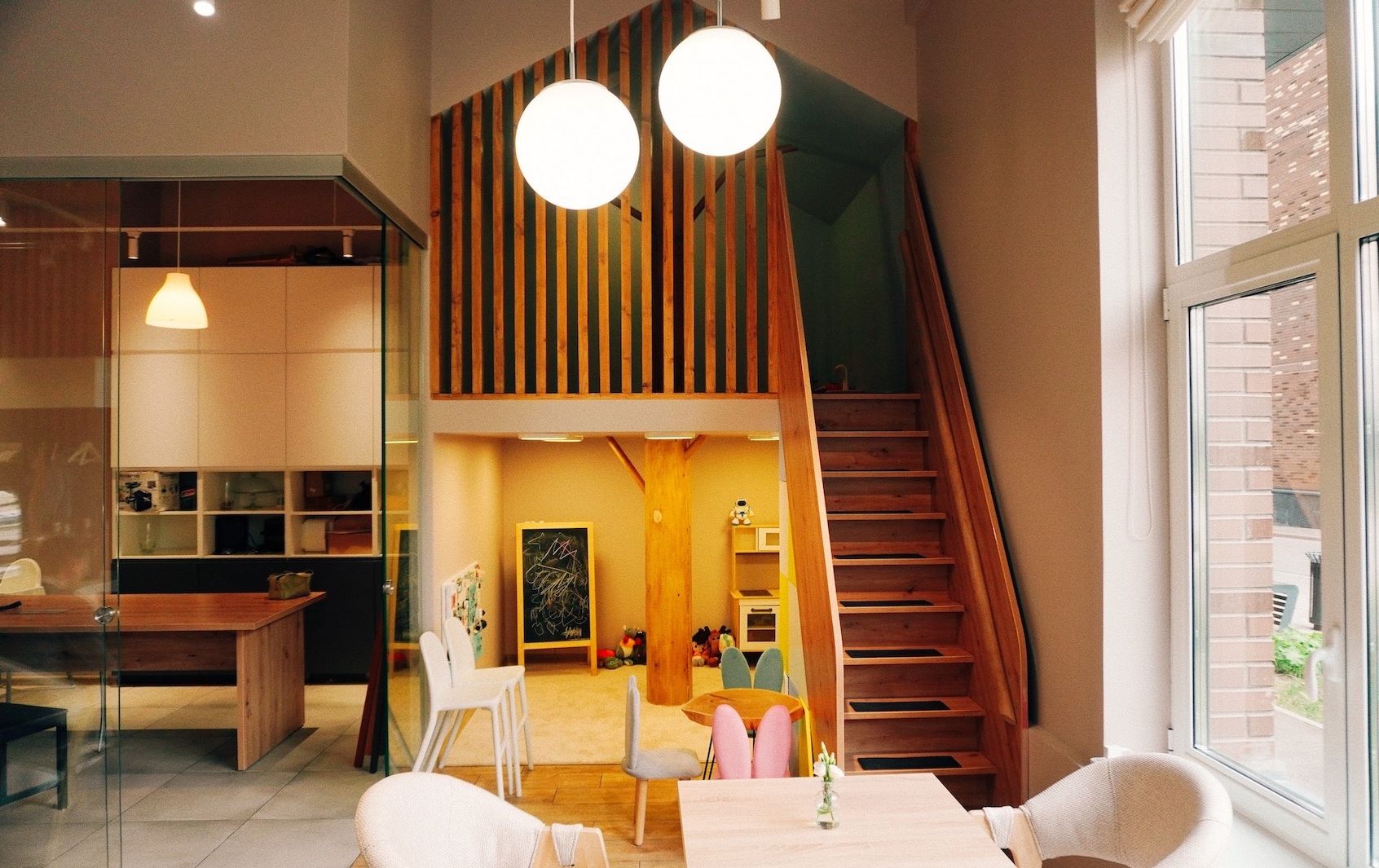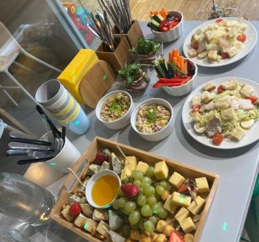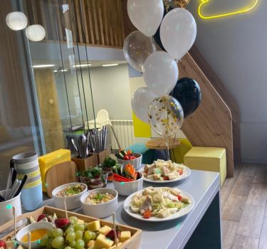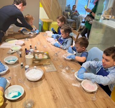 У нас удобная входная зона, кафе с самым настоящим домиком под деревом, где можно поиграть в прятки, и большая зона мастер-классов. Всё очень удобно, стильно и красиво. Мы подаем блюда европейской, итальянской и русской кухонь.