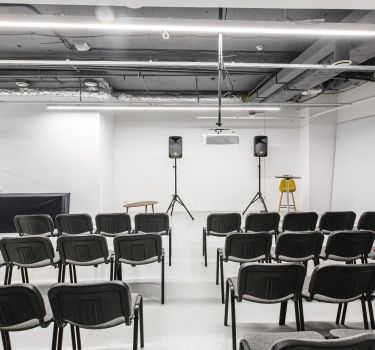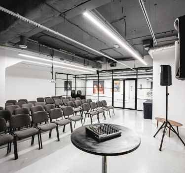 Cтильное пространство для лекций и мастер-классов, оформленное современным искусством. Идеально подойдет для презентаций, кинопоказов и воркшопов.