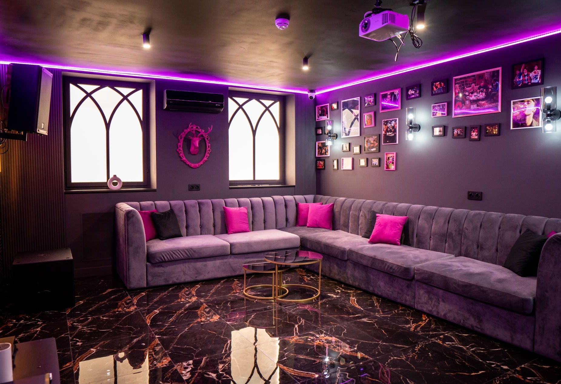 Фиолетовые стены, уютный велюровый диван на всю стену, неоновая подсветка, культовая рамка и галерея фото создают атмосферу, где хочется петь, смеяться и фотографироваться.
