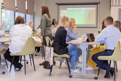 Стулья можно расставить в театральной рассадке (как на фото), полукругом, по группам, буквой П — по запросу.