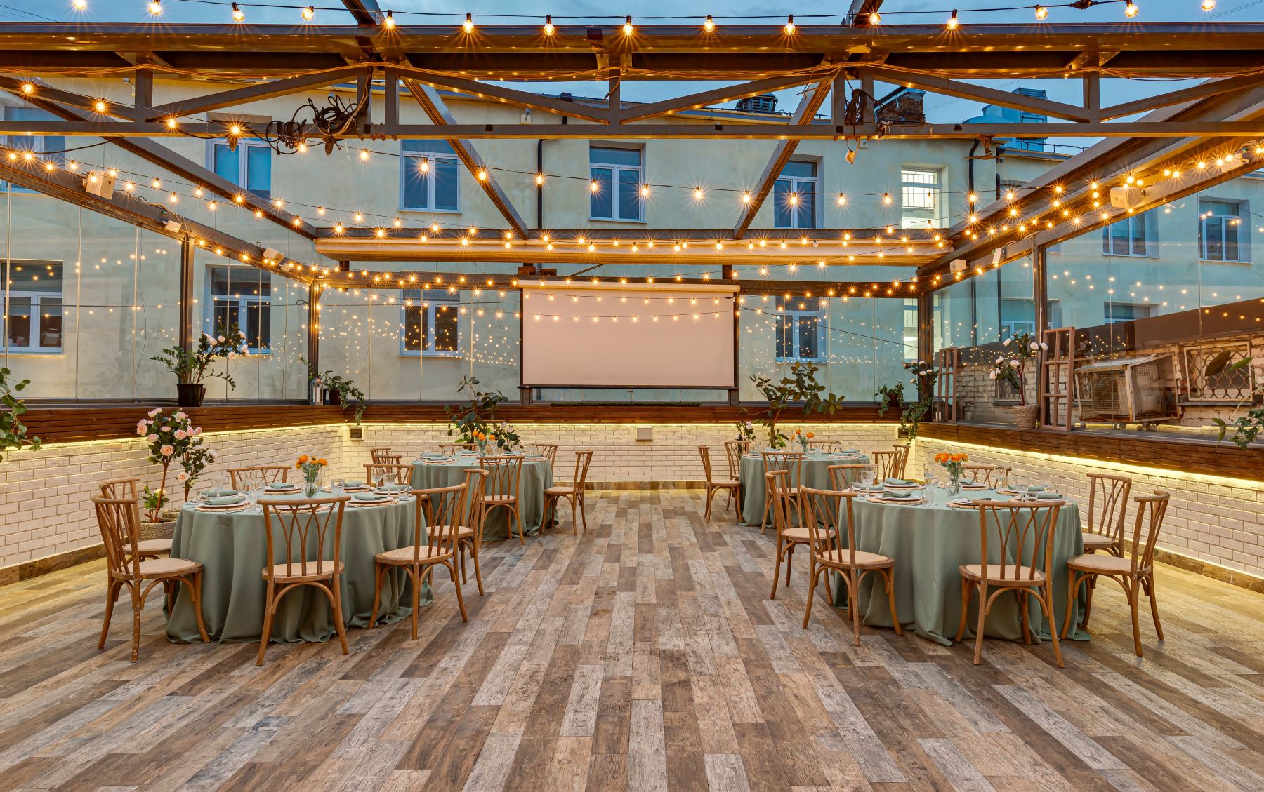Высокие потолки 4 метра, гирлянды с ретро лампочками, вечерняя светодиодная подсветка, декоративный камин и большое количество зелени создают незабываемую атмосферу для проведения любого мероприятия.