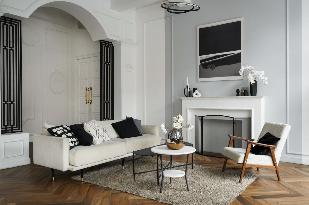 Открытое и светлое пространство — это то, что сразу привлекает внимание в этом зале. Стены белого цвета создают ощущение чистоты и свежести, а серые акценты добавляют сдержанной элегантности в зону гостиной и столовой.