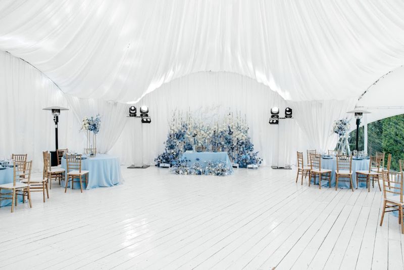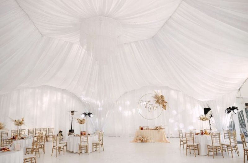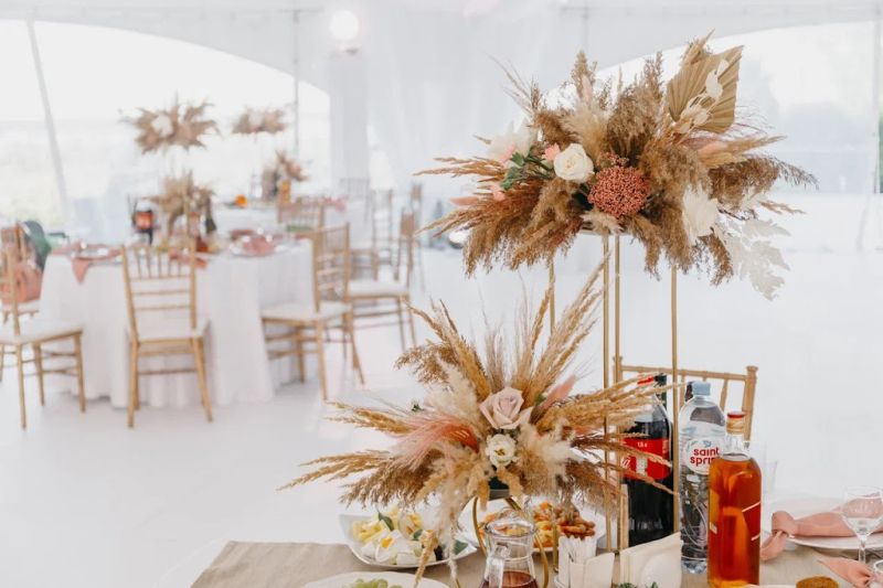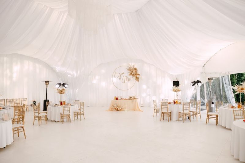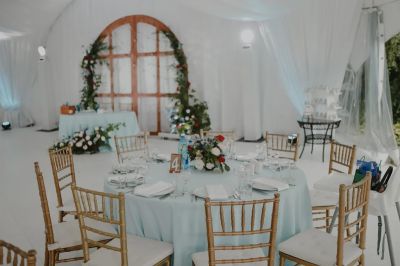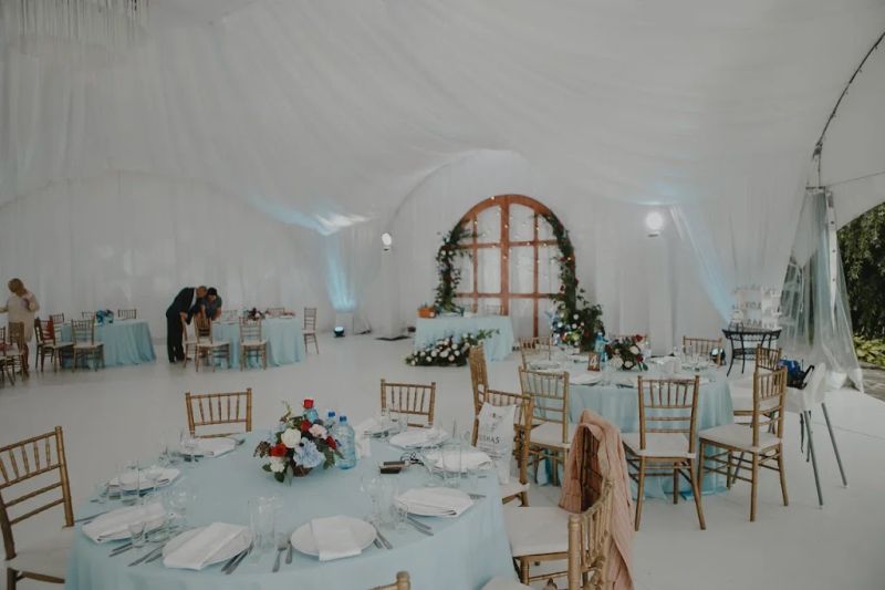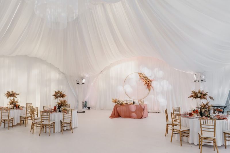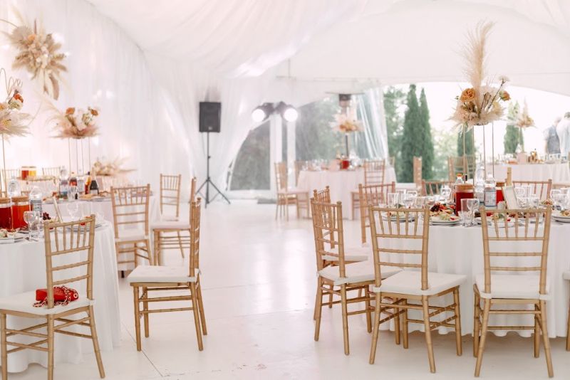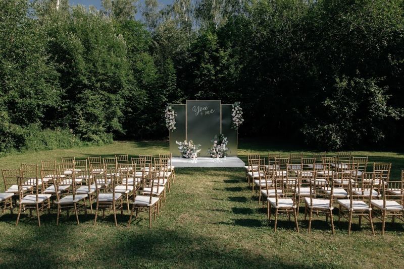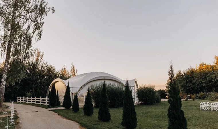 На территории зала раскинулись туи и розы, которые создают атмосферу уюта и свежести. А зелёный газон придаёт пространству особую красоту и элегантность.