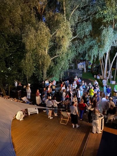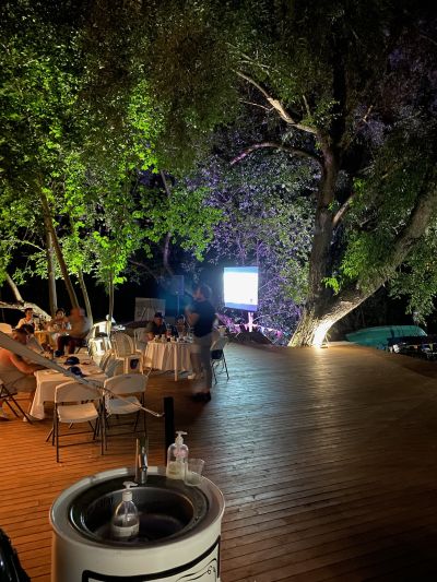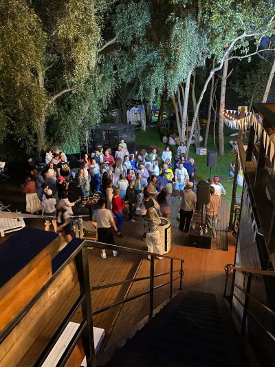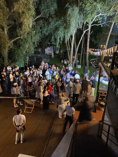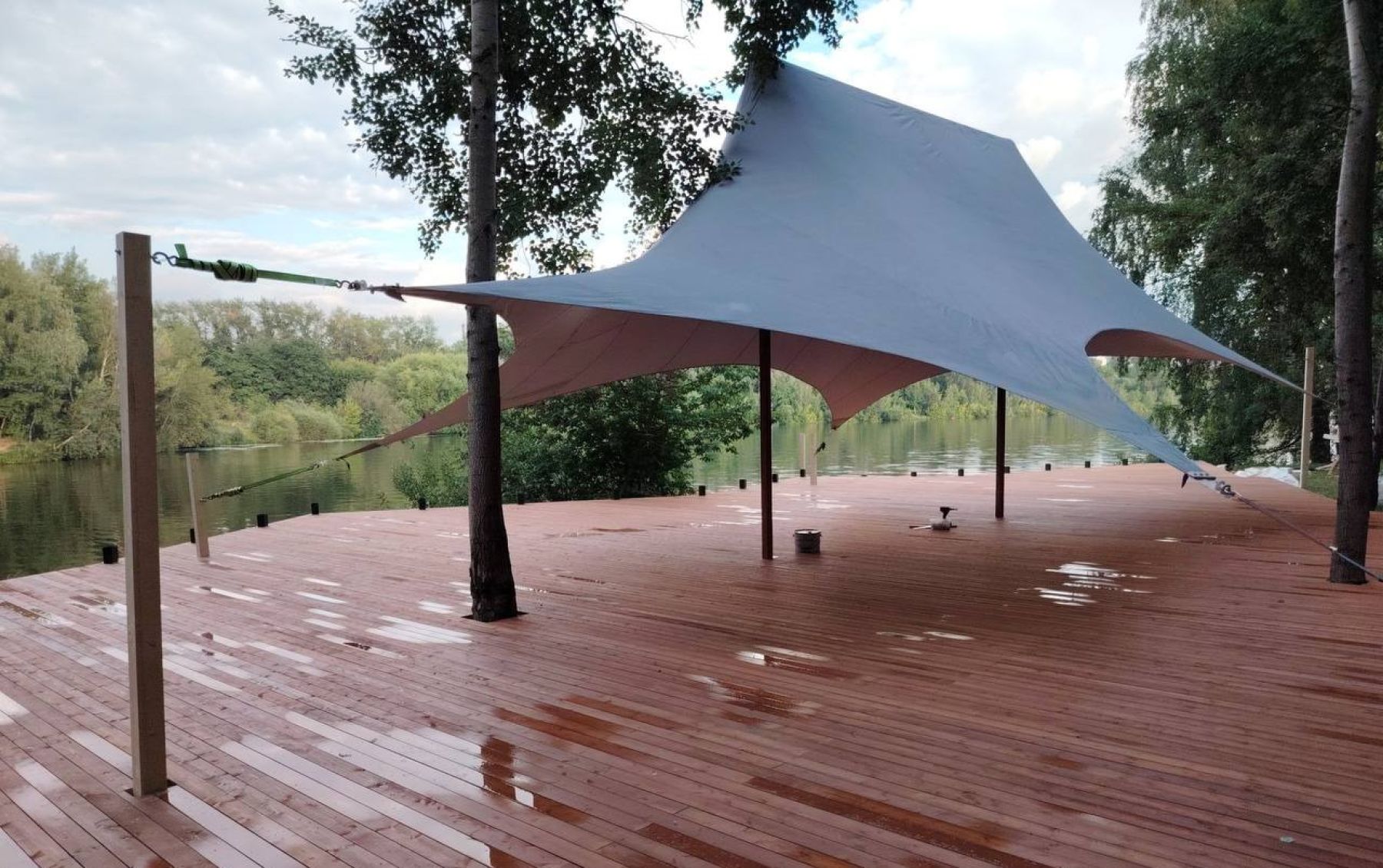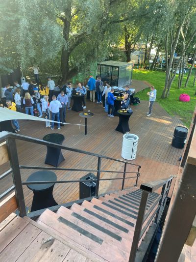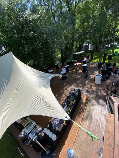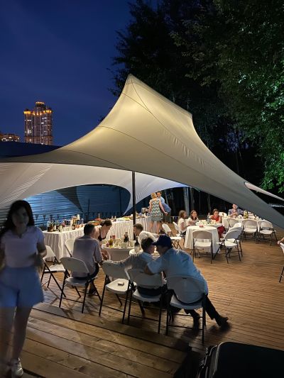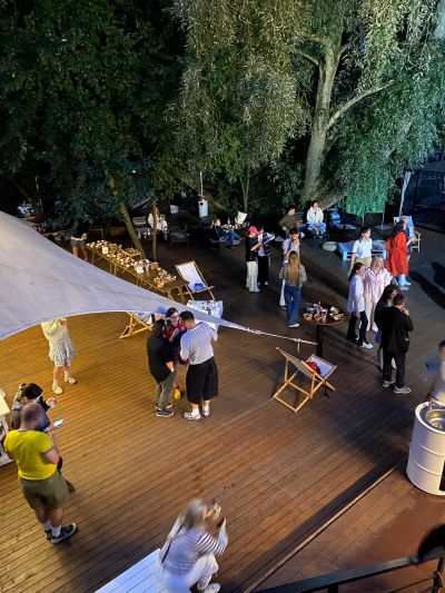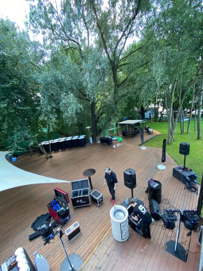 Большая терраса площадью 350 кв. м, расположенная на берегу водоема в черте города недалеко от центра Москвы на территории станции проката водного инвентаря. Рядом с террасой находится выход к понтонам на воде. По соседству с террасой расположен яхт-клуб.