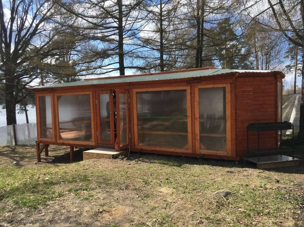 Беседка рассчитана на 35 человек. Оснащена мангалом, решёткой, углями и розжигом, есть столы и стулья. Беседка может быть как полностью закрытой, так и трансформироваться в открытую.