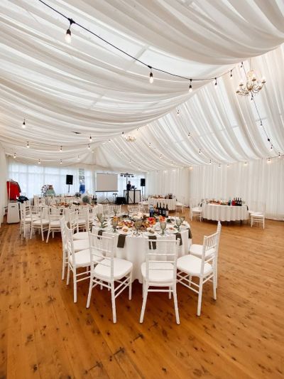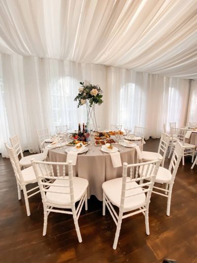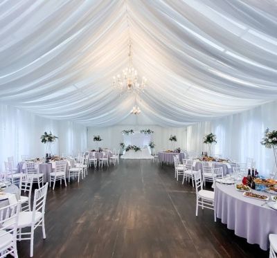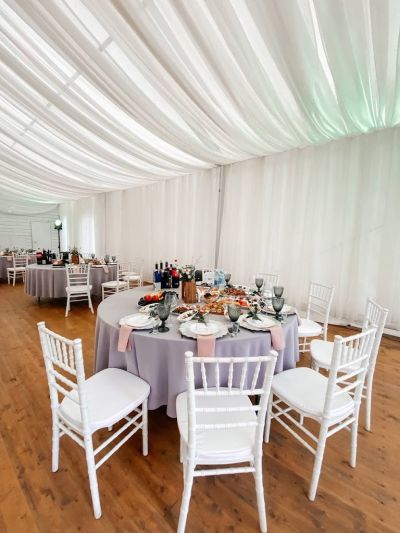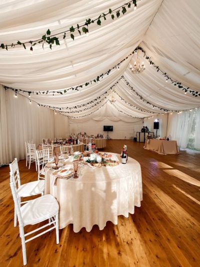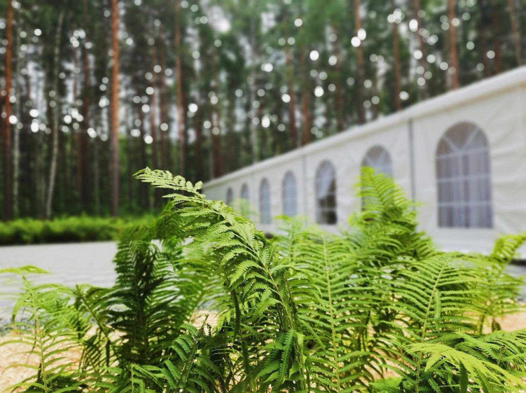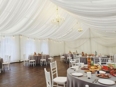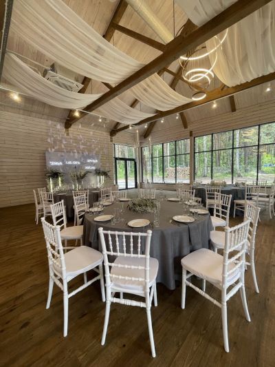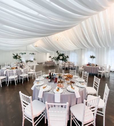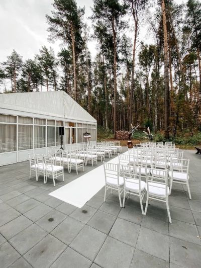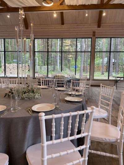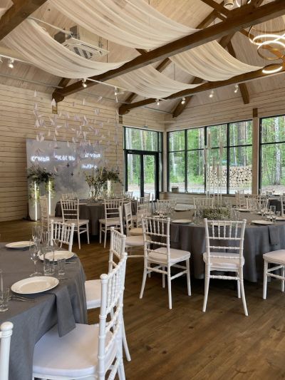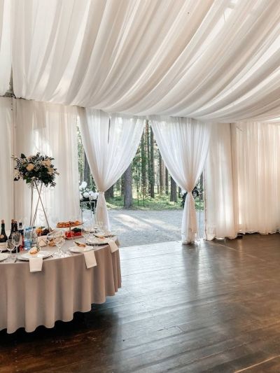 Первоклассный белоснежный шатер (250 кв. м.) с выходом в сосновый лес, подходящий для мероприятий различного формата.