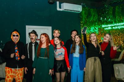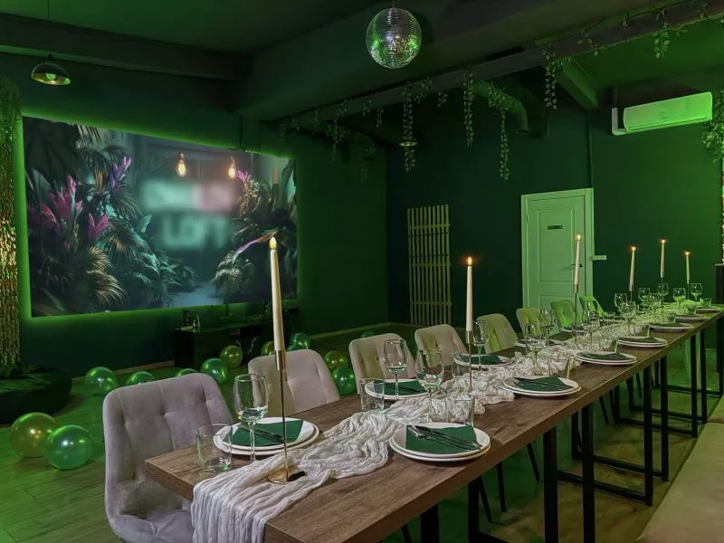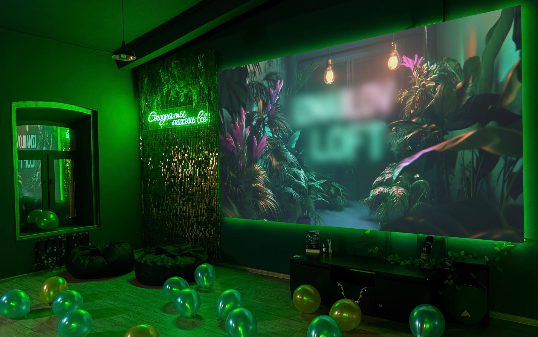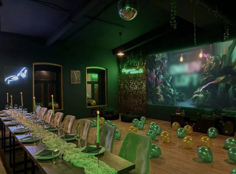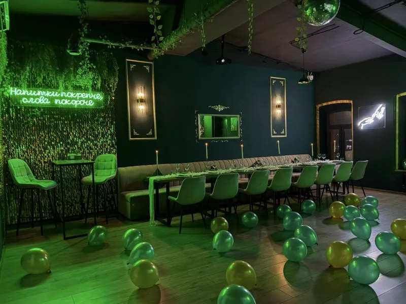 Стилизованный лофт - зал с караоке - это пространство, оформленное в современном стиле с неоновой подсветкой и арт-объектами. В интерьере преобладают зеленые оттенки, дополненные стильной мебелью и произведениями искусства, создающими эстетику роскоши.