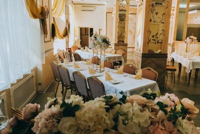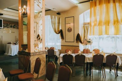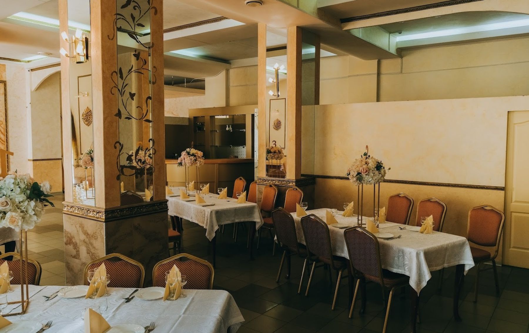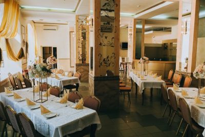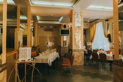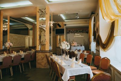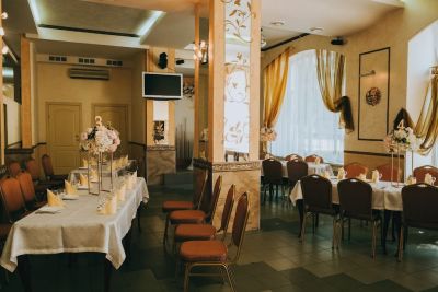 Классический зал, стильное оформление, есть барная стойка.