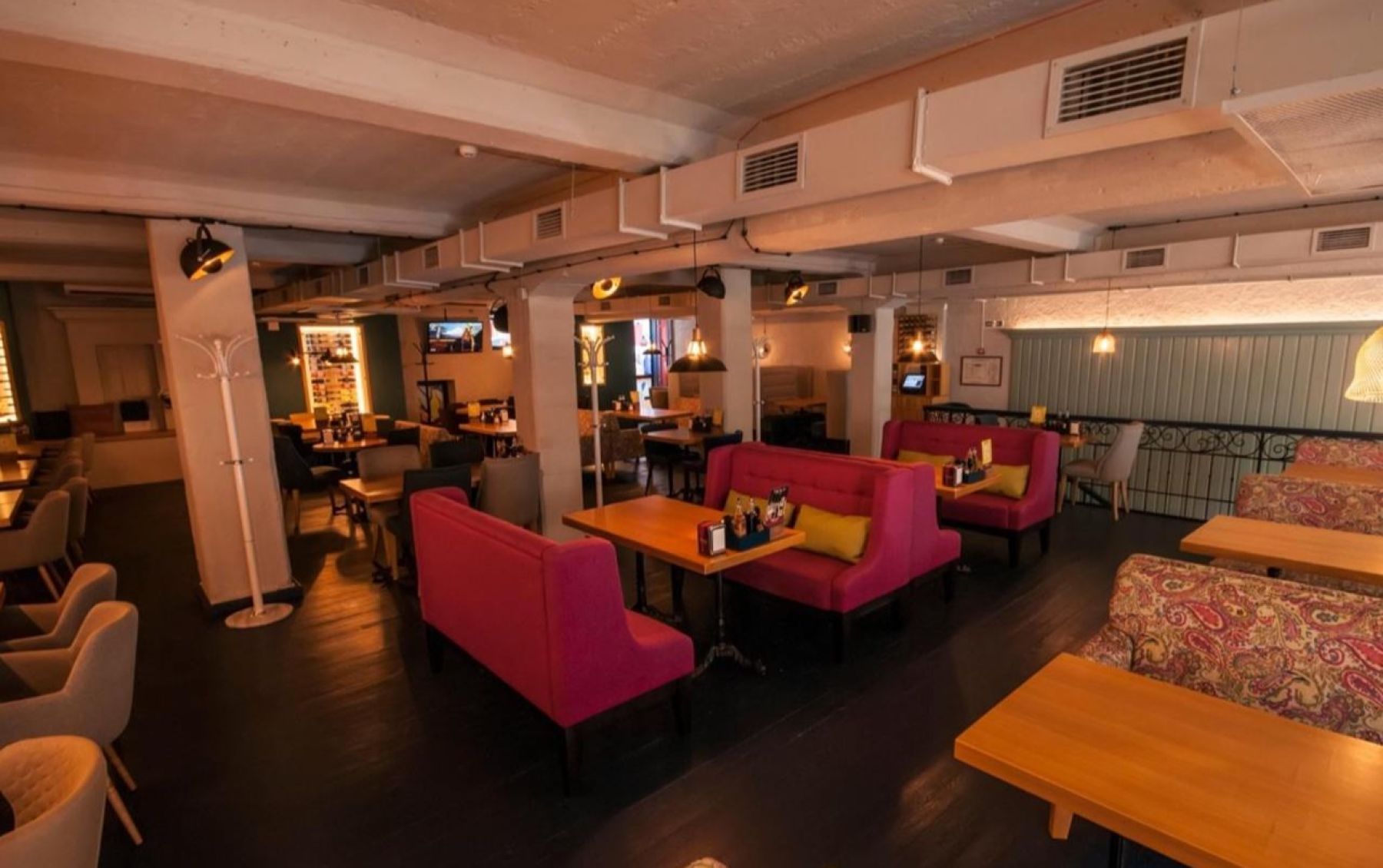 В интерьере светлые стены с навесными ящиками-полками контрастируют с салатовым, синим и малиновым цветом мягких кресел и уютных диванчиков.