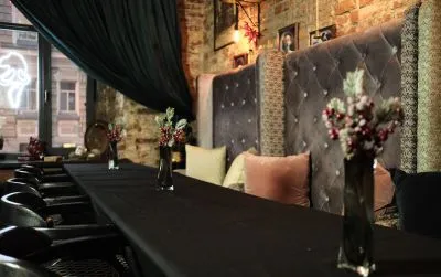 В зале вы найдёте множество интересных деталей, которые помогут создать нужную атмосферу. Здесь есть кованая скамейка, уличный фонарь, настоящий таксофон и светящаяся неоновая надпись Hard Rock Avenue. Также в зале есть зона с цепями, вмонтированными в кирпичную стену, деревянный крест и атрибутное кресло.