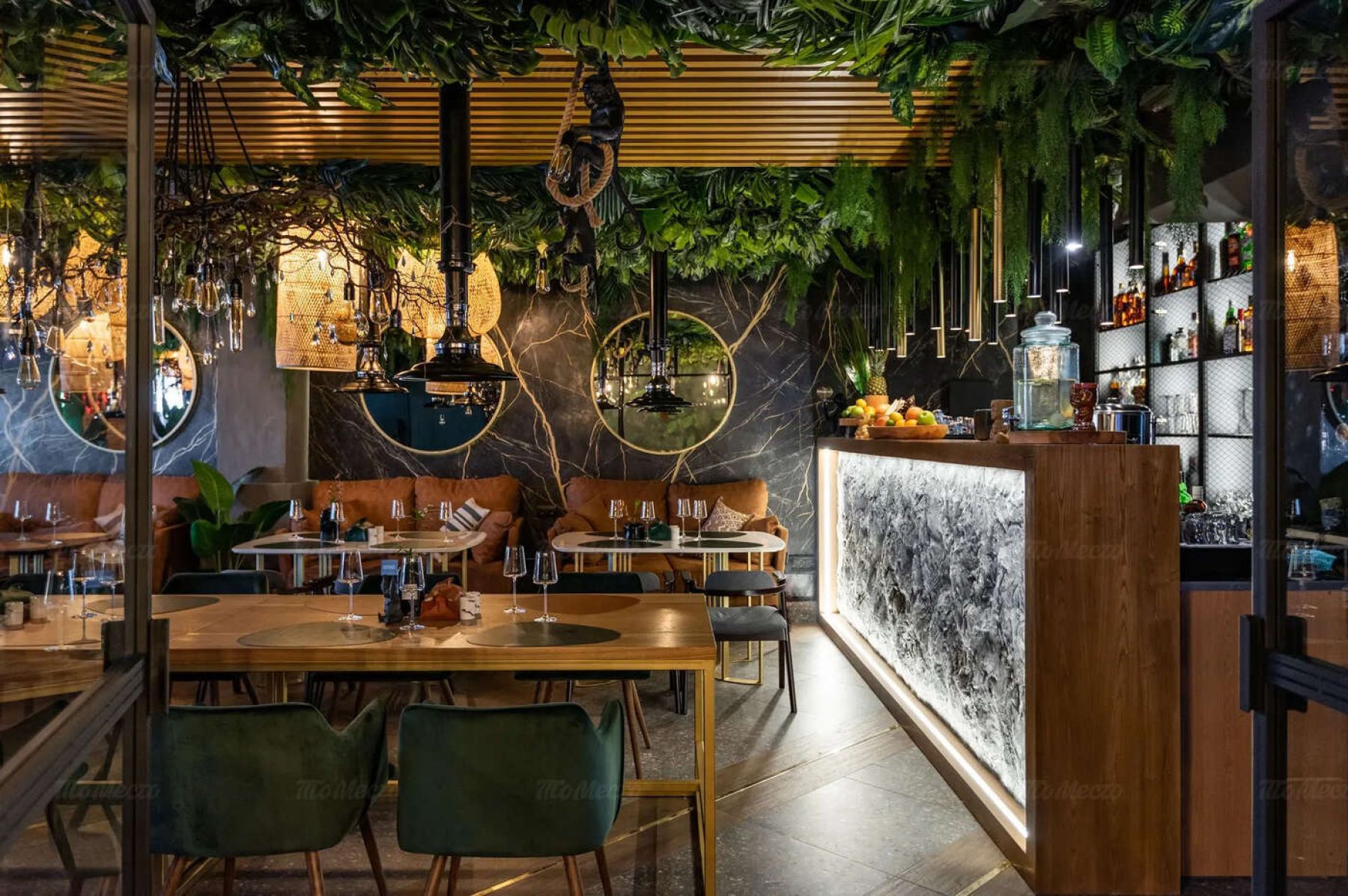 Заведение представляет собой оригинальный авторский проект с эксклюзивной концепцией, которая не имеет аналогов в Уральском крае. Ресторан состоит из нескольких залов, оформленных в стиле непроходимых вечнозелёных лесов тропических джунглей. Вас встретят декор из тропических растений, натуральные материалы и природные цвета в отделке, лампы в плетёных абажурах и декоративные панно с изображением шимпанзе и обезьянок, качающихся на верёвочных лианах.