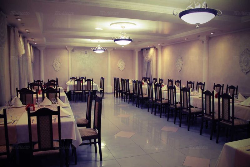 На втором этаже расположен просторный банкетный зал со строгими стульями, белыми скатертями и бежевыми стенами. Это идеальное место для проведения торжественных мероприятий, таких как свадьба или юбилей.