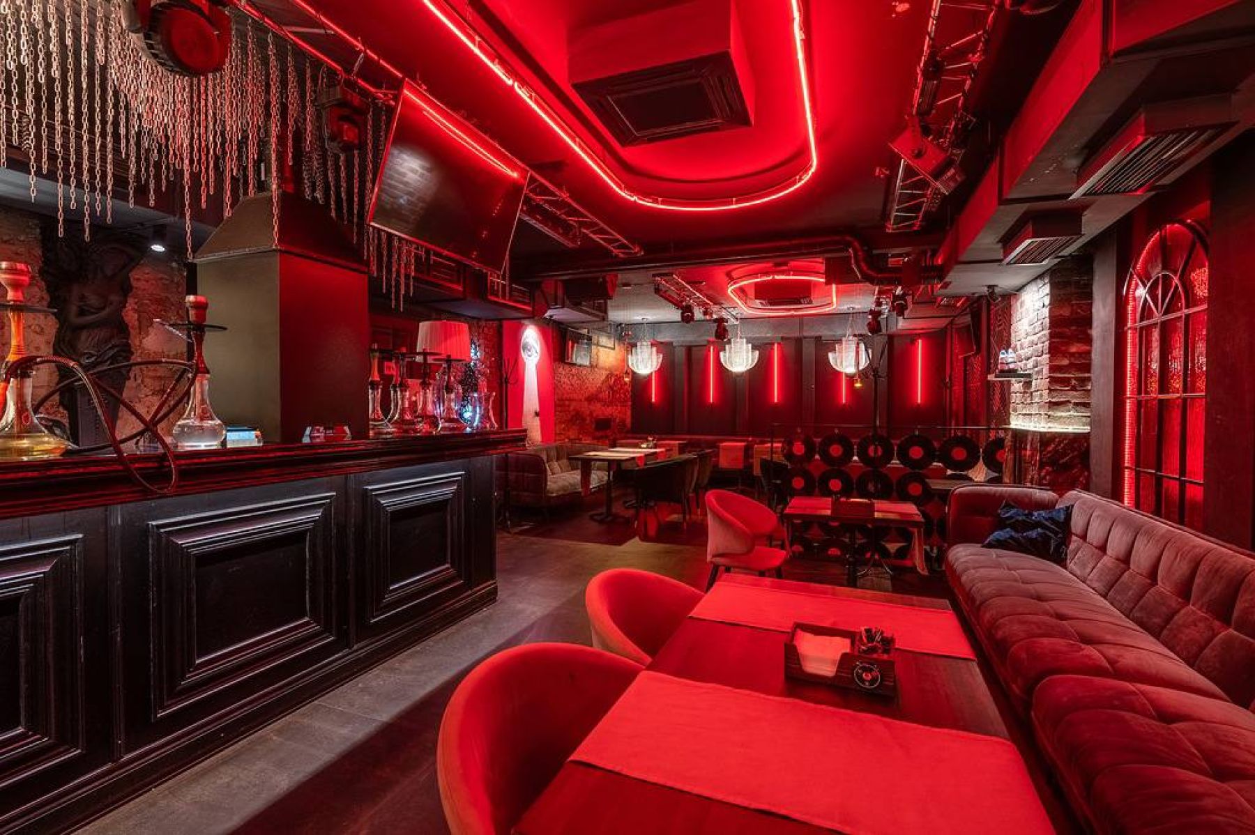 Интерьеры оформлены дерзко и эклектично: в залах сочетаются небрежная кирпичная кладка, красный неон и благородные массивные кресла. Над барной стойкой висят гирлянды цепей, а под ними — статуи ангела и греческой кариатиды.