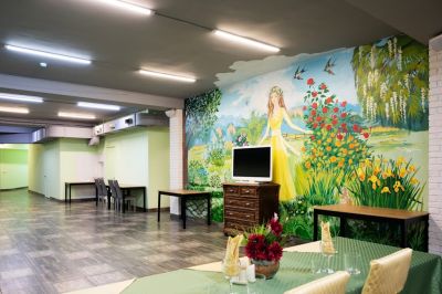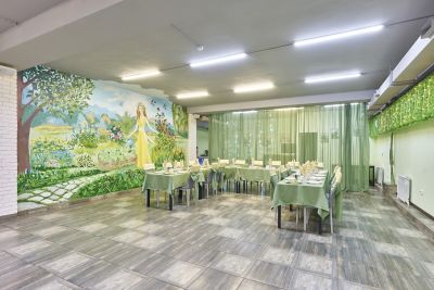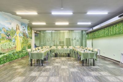Просторный банкетный зал с уютным интерьером подходит для любых мероприятий. В меню — блюда русской и европейской кухни, а для детей есть отдельное меню. Пробковый сбор отсутствует, поэтому можно приносить свои напитки и торт.