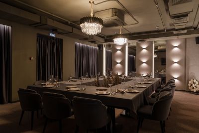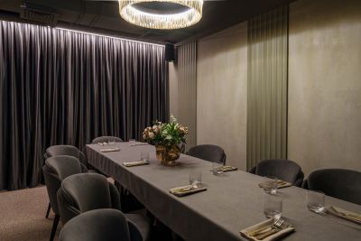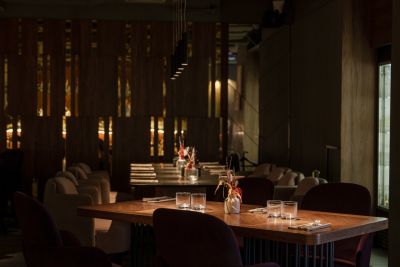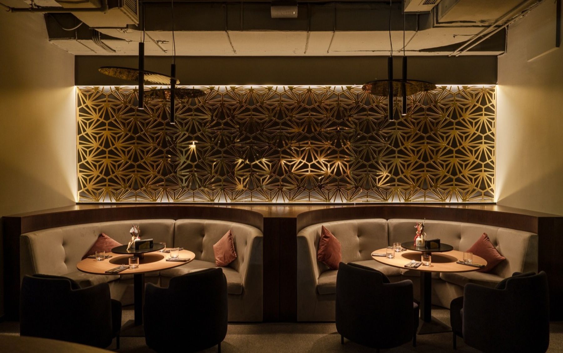 Ресторан создаёт атмосферу уюта, идеальную для небольших встреч и крупных торжеств. Интерьер сочетает восточный стиль с современными элементами: яркие акценты, пряные ароматы, резные колонны и цветные ширмы добавляют шарм, стильные абажуры и необычный потолок из стальных труб.