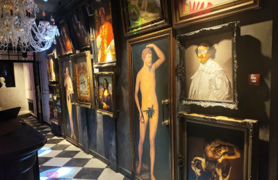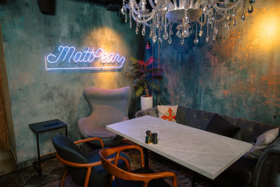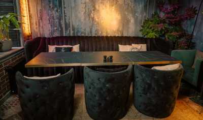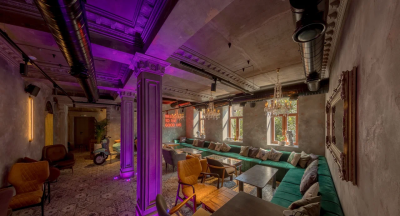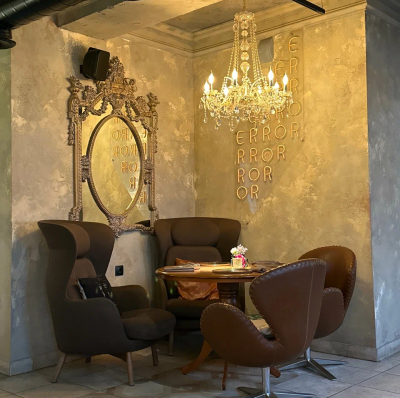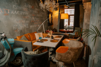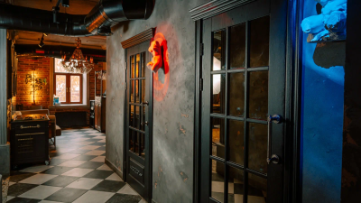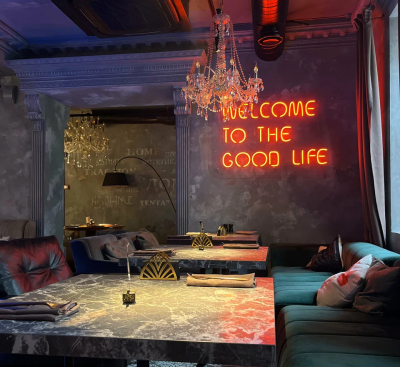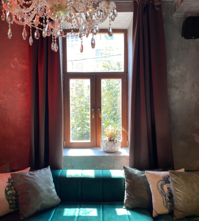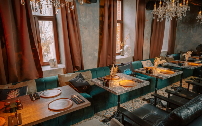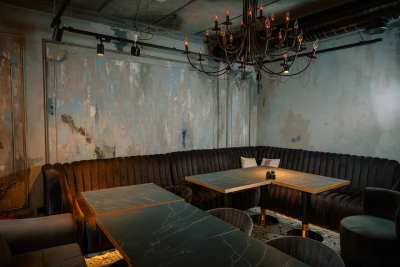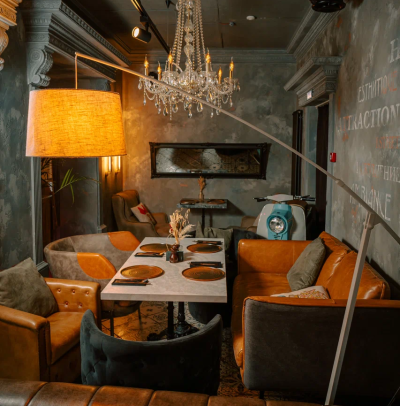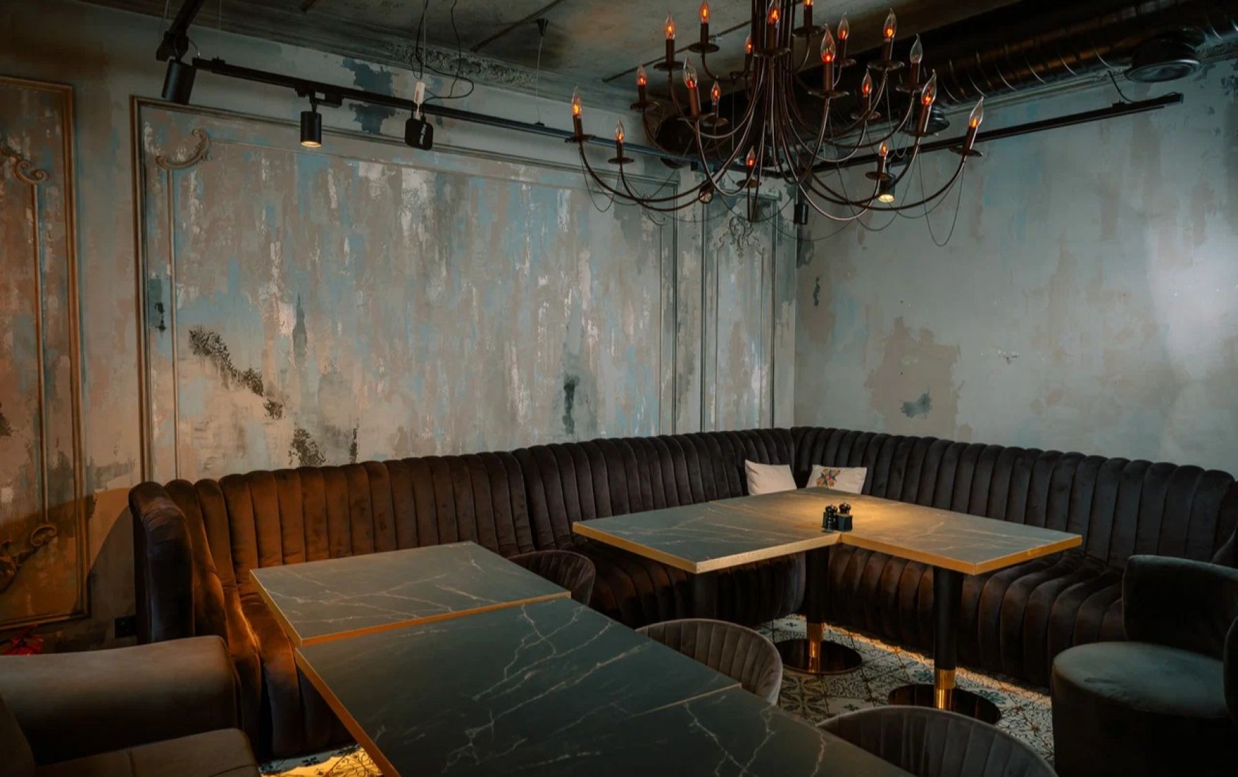 Каждая деталь, от лепных бордюров и узких колонн до художественно оформленных ниш и сложной подсветки, подчёркивает эксклюзивность пространства. Бархатные диваны, тяжёлые шторы, кожаные кресла, готическое зеркало и уютный фонтан.